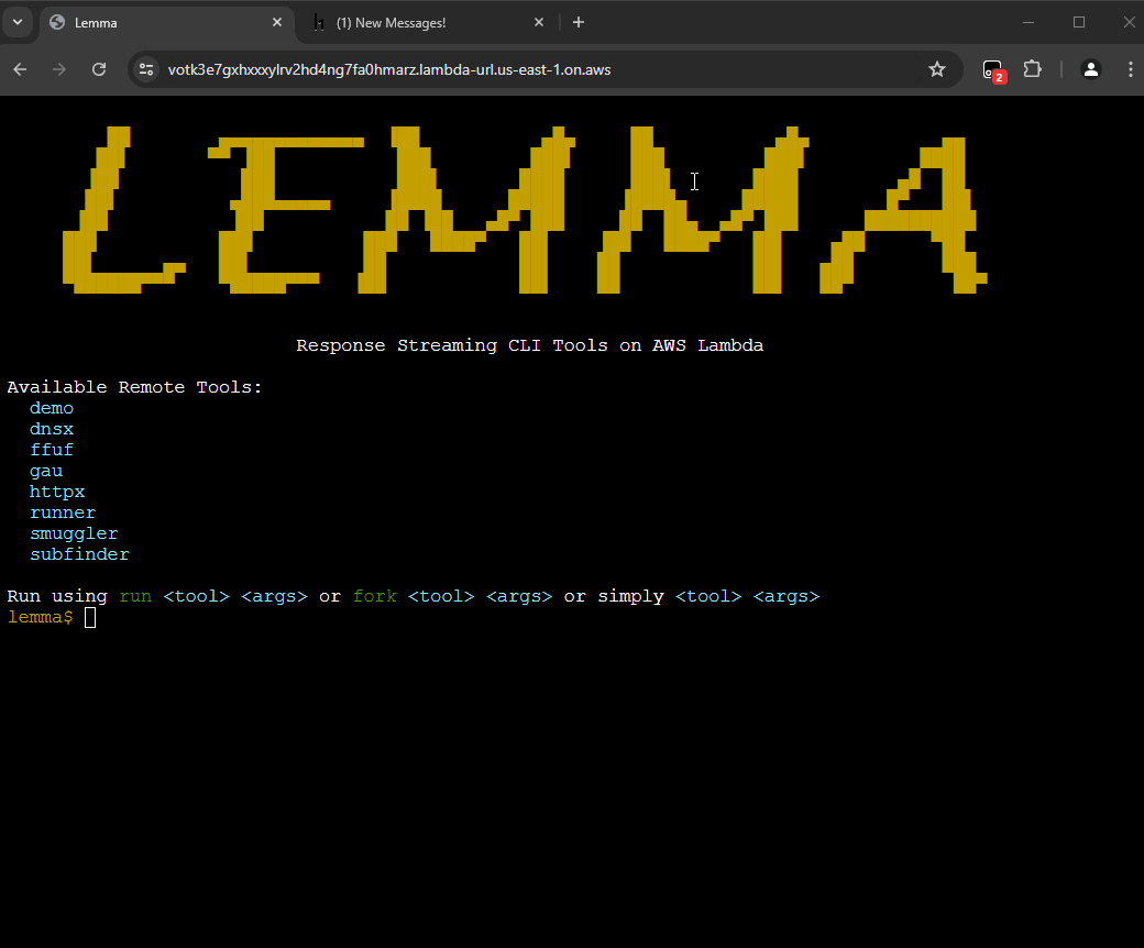 Lemma's web client is packaged inside the Lemma function itself for easy access. It simply is just 1 html file and 1 javascript file (Also importing xterm.js from CDN). To access it simply just copy and paste your lemma lambda url/key into your chrome web browser and hit enter. For usage details just type the `help` command.