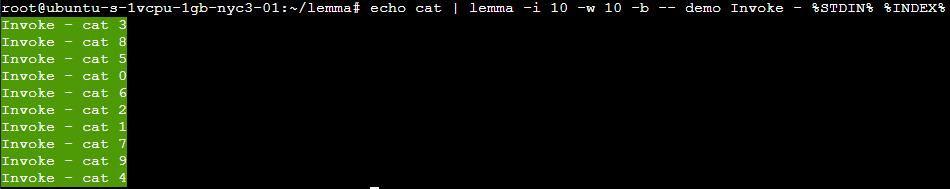 echo cat | lemma -i 10 -w 10 -b -- demo Invoke - %STDIN% %INDEX%