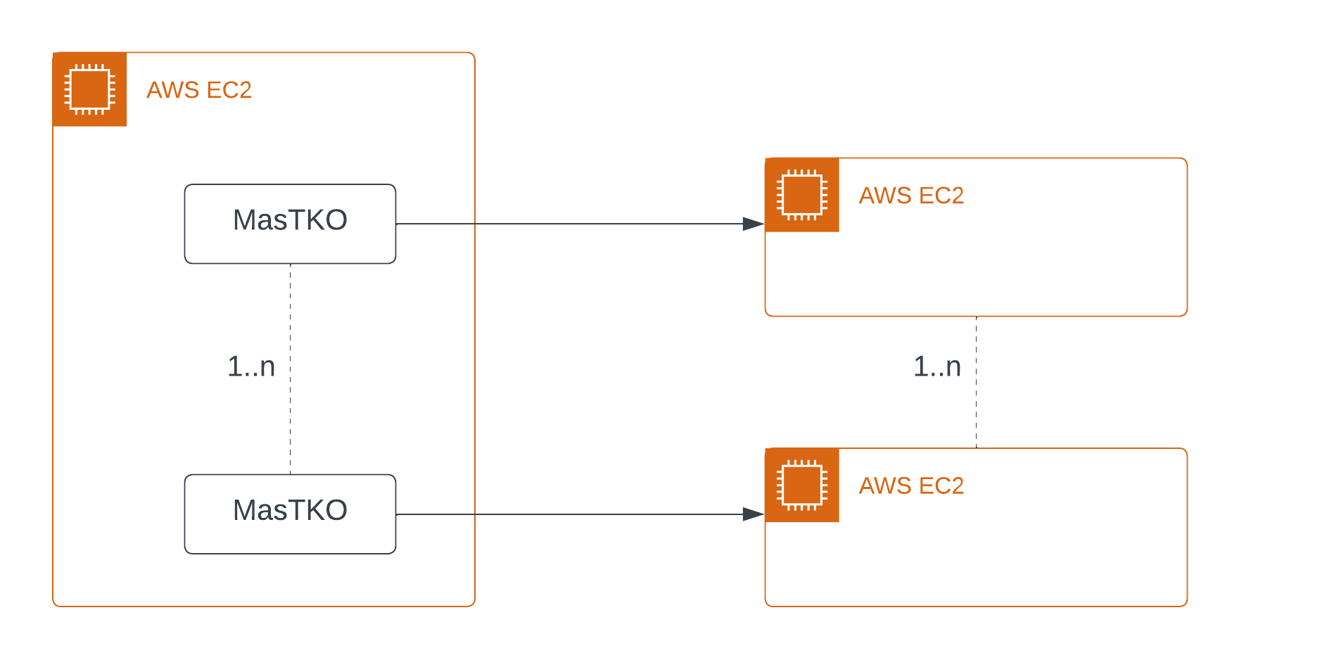 Run 1..n instances of MasTKO inside a AWS EC2 instance, each instance of MasTKO will require a unique AWS EC2 Instance Id and a unique AWS Elastic IP. This pattern is beneficial to run parallel instances of MasTKO to achieve greater probability of takeovers but will also increase cost. An additional benefit, versus pattern 2, is it removes dependency on a local machine, and theoretically will be faster because of reduced network path.